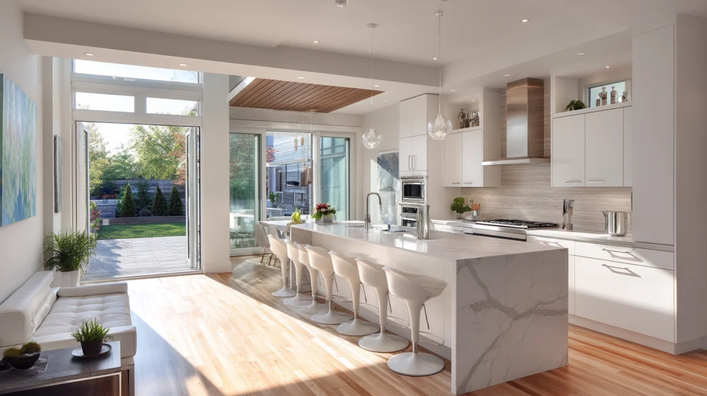 Transitional kitchen designs, where the kitchen extends into living or dining areas, are increasingly desired for their openness and flexibility. Well‑designed spaces manage visual flow with matching cabinetry, consistent countertops, and coordinated finishes that help the kitchen feel integrated, not overwhelmed. The kitchen island often becomes part of the living furniture, blending cooking, eating, and entertaining zones smoothly.