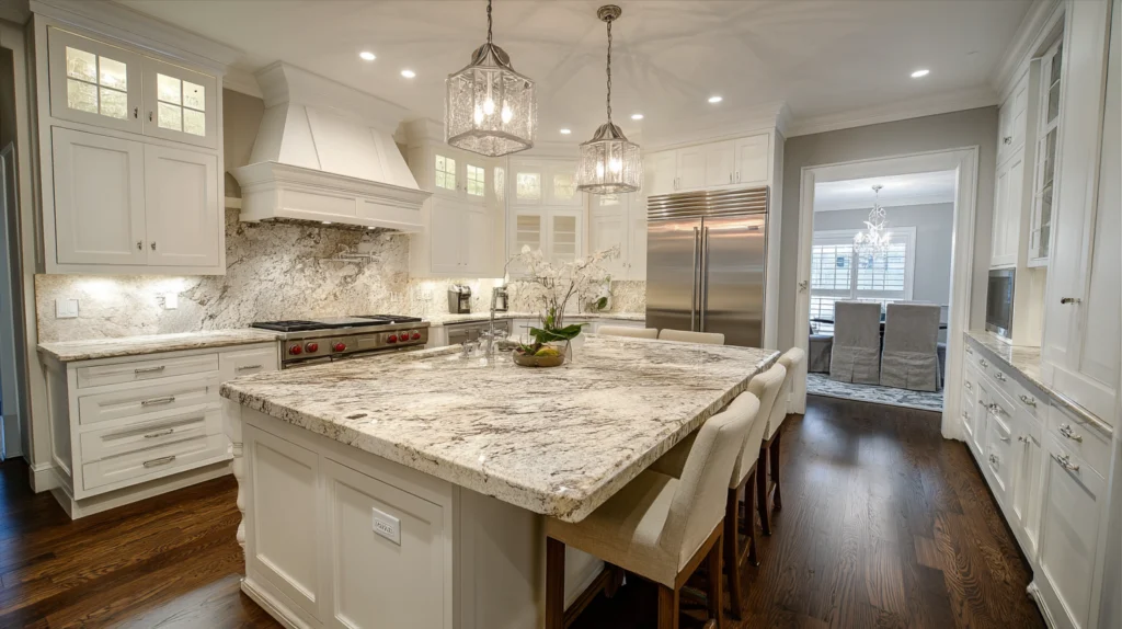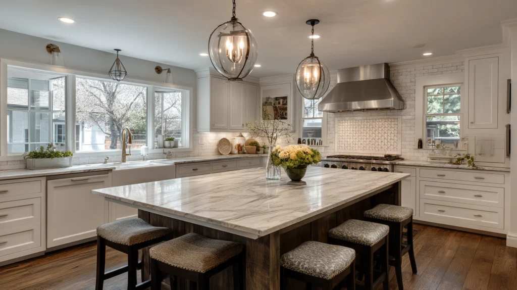 In large kitchens, the island becomes a statement piece. These islands may include multiple zones for cooking, dining, and entertaining.