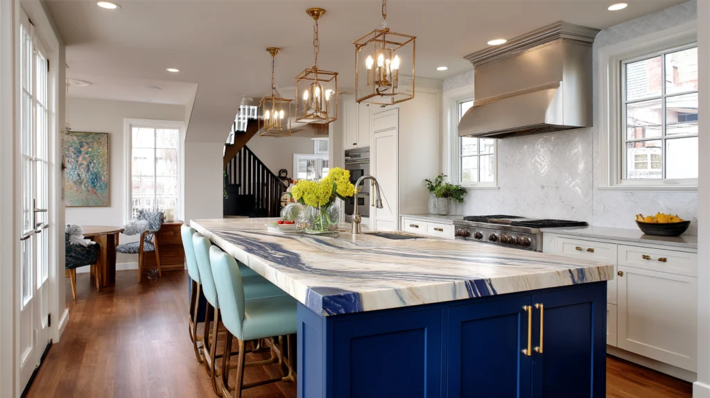 Material selection plays a major role in both the beauty and function of modern kitchen islands. Homeowners are favoring textured wood finishes, soft matte surfaces, and quartzite countertops for their durability and natural stone appearance.