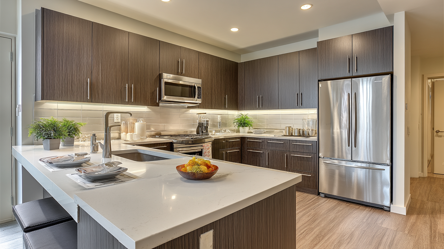 Contemporary kitchens favor intentional contrast and sleek lines. Dark cabinets paired with light quartz or neutral countertops produce a dramatic, modern look that also celebrates material performance and minimal veining.