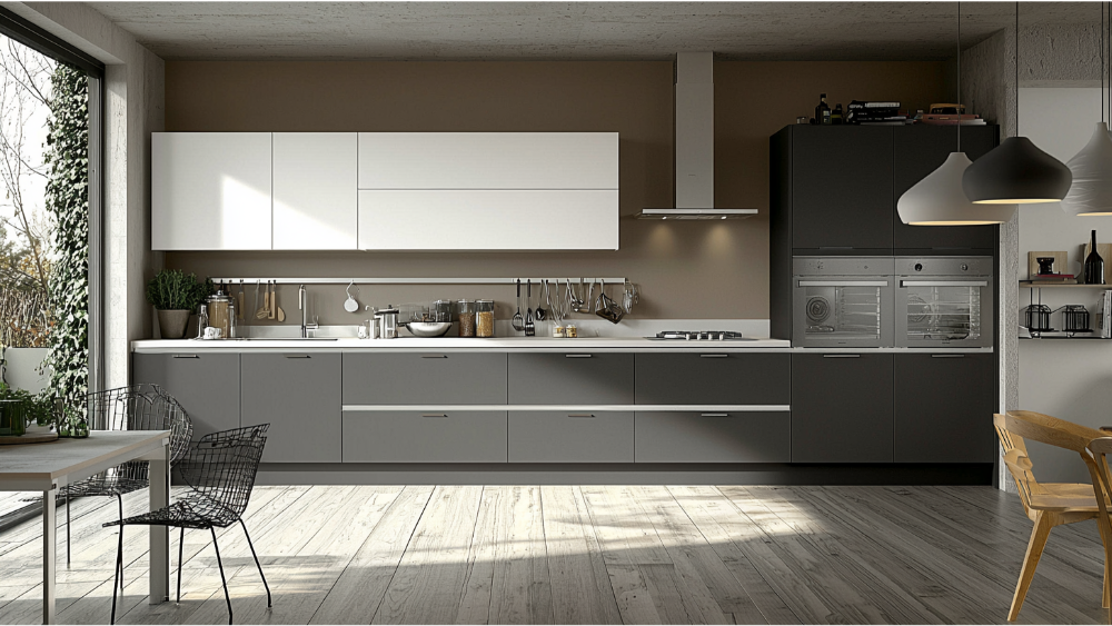 Some kitchens use different colors side-by-side in one linear cabinet layout. For example, a wall of black cabinets with an adjacent run in a warm wood tone creates visual separation between prep areas and dining zones.